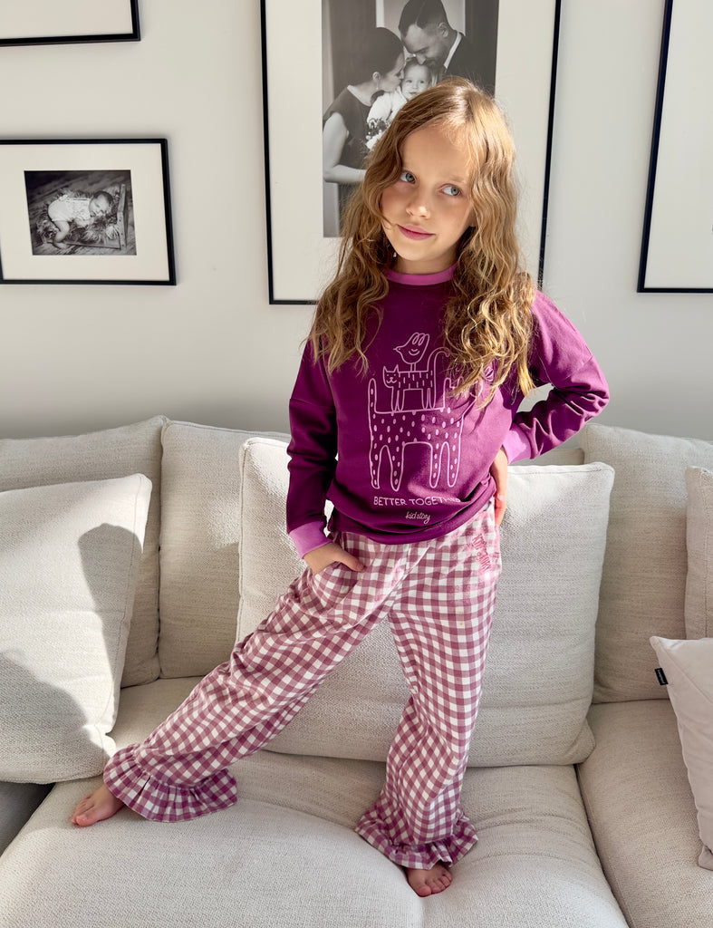 Wygodny i miękki longsleeve w kolorze BORDO z kontrastowymi, różowymi wykończeniami przy dekolcie. Na przodzie znajduje się urocza grafika, która dodaje całości radosnego, dziecięcego charakteru.